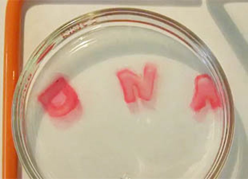 To demonstrate the effect, the researchers created hydrogels in molds shaped like the letters D, N, and A. Poured out of the molds, the gels became amorphous liquids, but in water they morphed back into the letters.
