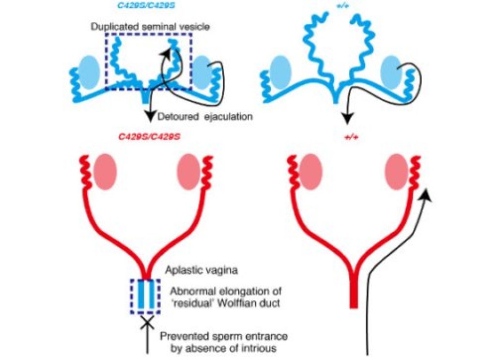 In these infertile mice, the beta-catenin pathway was not shut off properly in certain tissues, leading to malformations of the sexual organs, namely the seminal vesicles in males and vaginas in females, that prevented them from successfully reproducing.