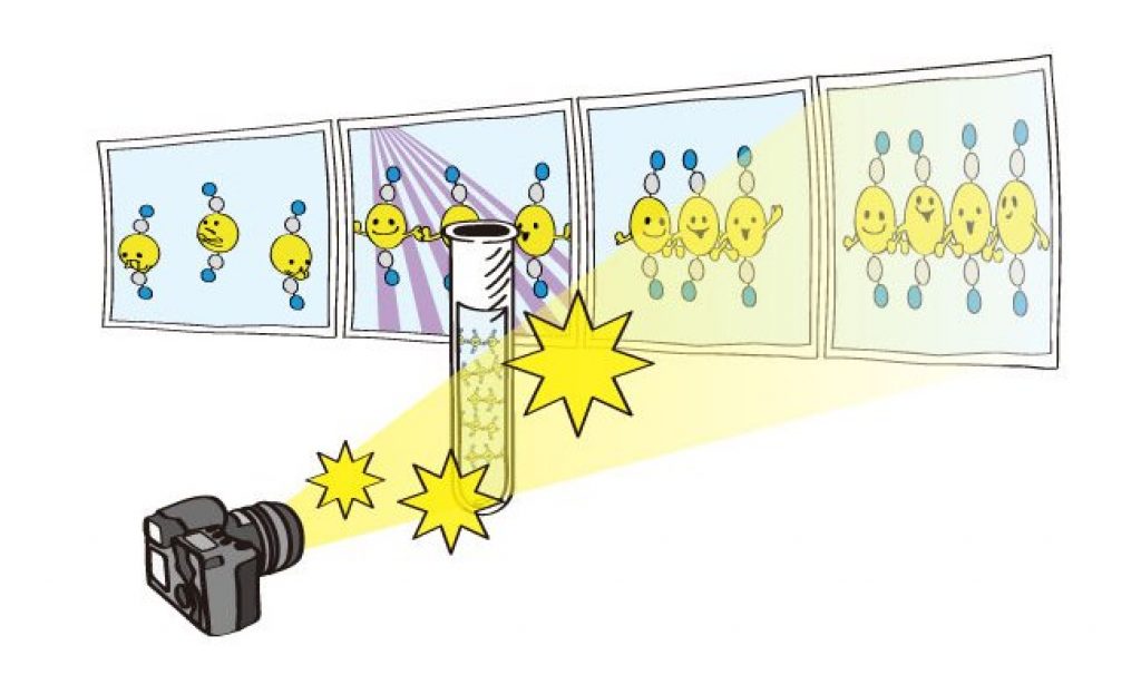 In this study, the research group focused on the process of photoinduced bond formation between gold (Au) ions dissolved in water. In the ground state (S0), Au ions are weakly bound to each other by an electron affinity and aligned in a bent geometry. Upon a photoexcitation, the S0 state rapidly converts into an excited (S1 state) state where Au-Au covalent bonds are formed among Au ions aligned in a linear geometry.