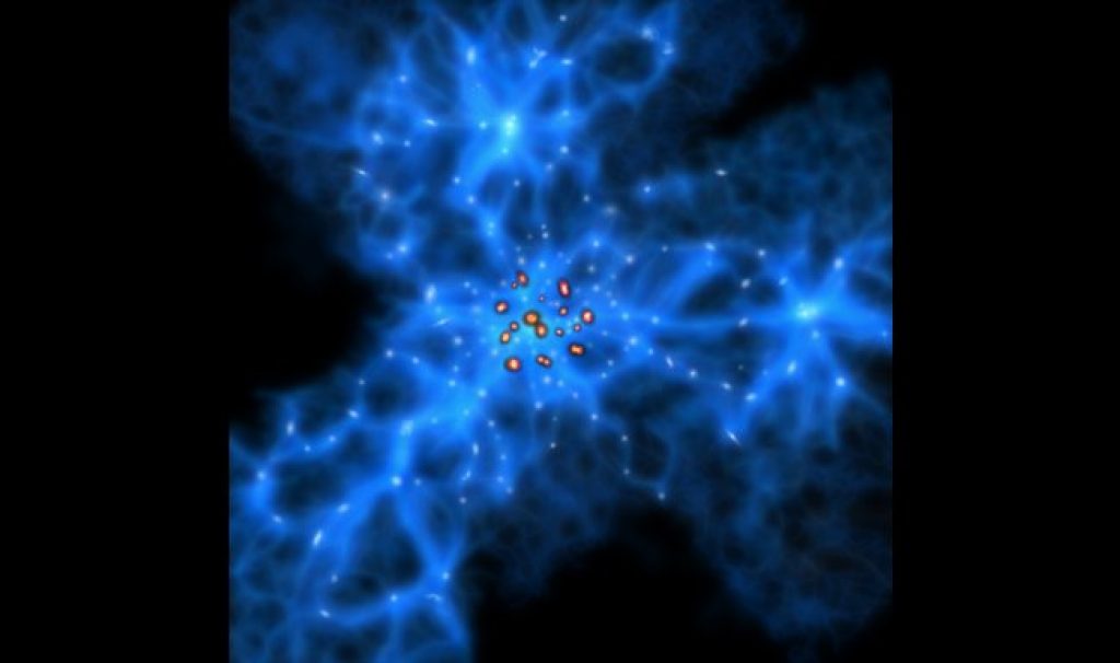 AsianScientist (Dec. 14, 2015) – Astronomers have discovered a nest of monstrous baby galaxies 11.5 billion light-years away using the Atacama Large Millimeter/submillimeter Array (ALMA). The young galaxies seem to reside at the junction of gigantic filaments in a web of dark matter.
