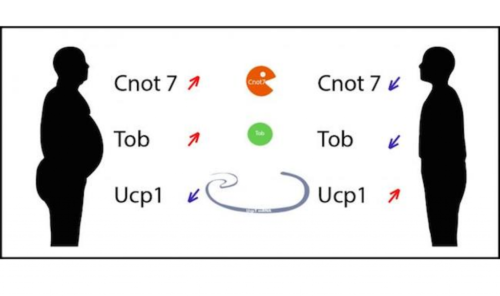OIST scientists found how Cnot7, Tob, and Ucp1 are functionally related. In order to supply the fat cells with functional Ucp1 protein, the Ucp1 gene has to be transcribed into another molecule called messenger RNA, or mRNA. The stability of Ucp1 mRNA is important to control the total amount of Ucp1 available in the cell, and ultimately, the destiny of stored fat. In obese mice, Cnot7 and Tob degrade Ucp1 mRNA, so that it can no longer be used to make Ucp1 protein.
