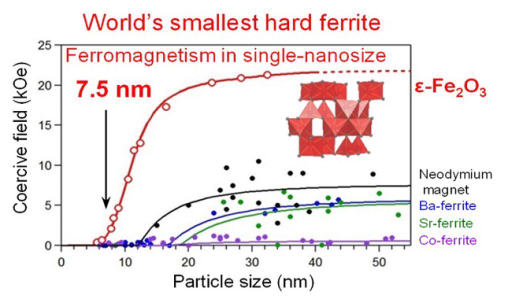 However, developing such particles remains a challenge. Ferrite magnets have the chemical stability required at the nanometer scale, but since existing materials cannot maintain magnetism as particle size is reduced, there were no hard ferrite magnets with a particle size of less than ten nanometers.