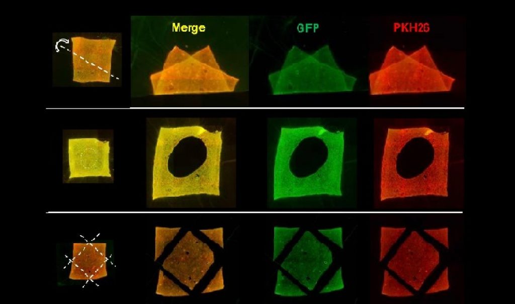 The double-layered cell constructs were also tested for their stability and flexibility. The cells remained attached despite folding the constructs or trimming them to fit the shape of a particular defect.